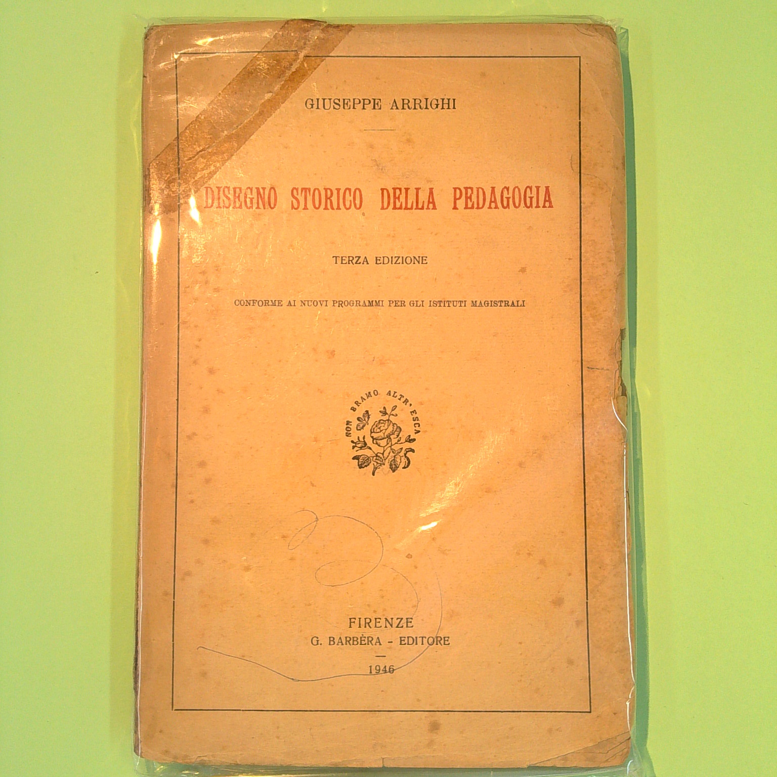 Condizioni: Discrete – La copertina inferiore e le ultime due pagine presentano un ritaglio – Il libro è interamente sottolineato a matita, matita rossa e bue penna – alcuni appunti a margine a penna