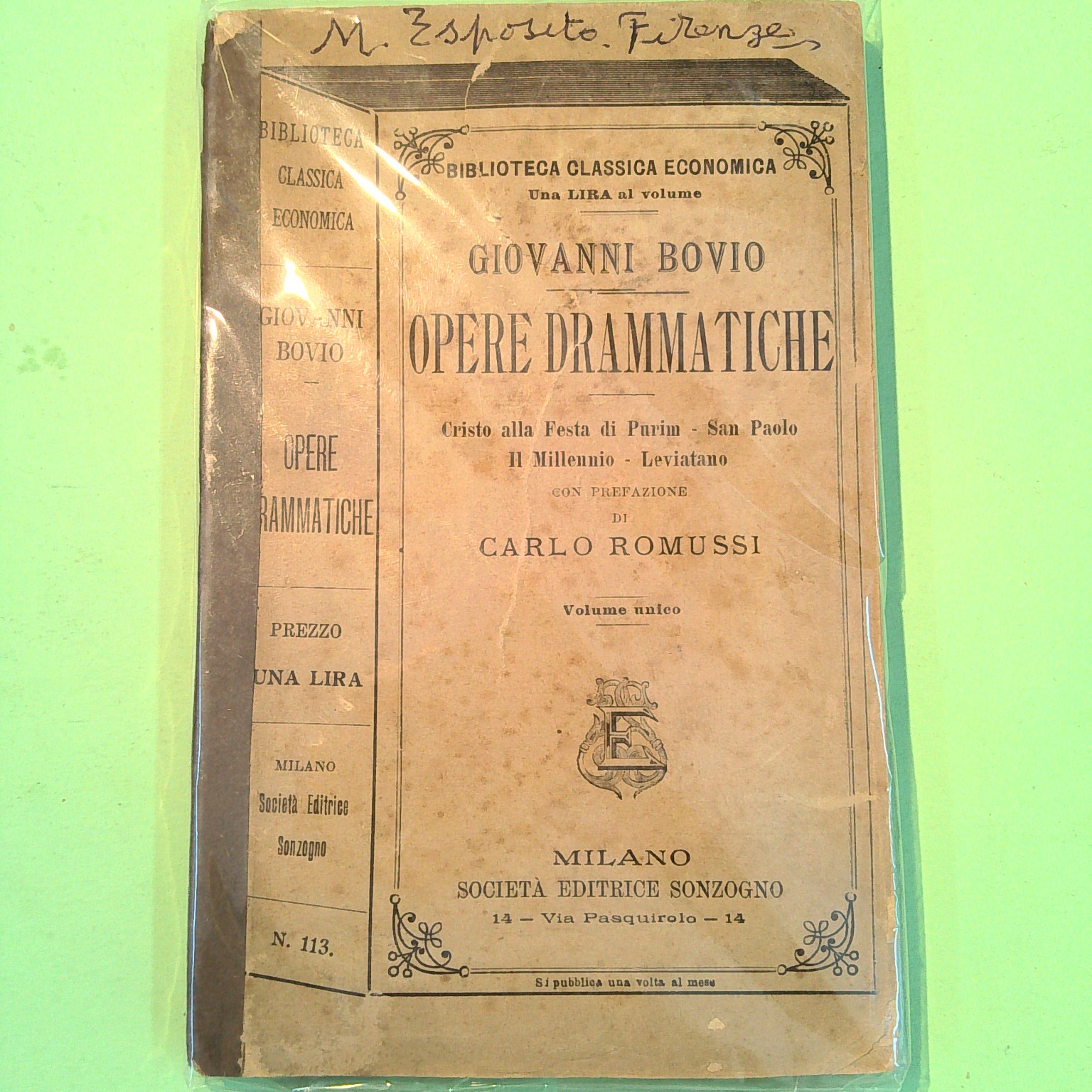 Condizioni: Buone – Uno strappo e firma a penna sulla copertina superiore – Riparazione sul dorso